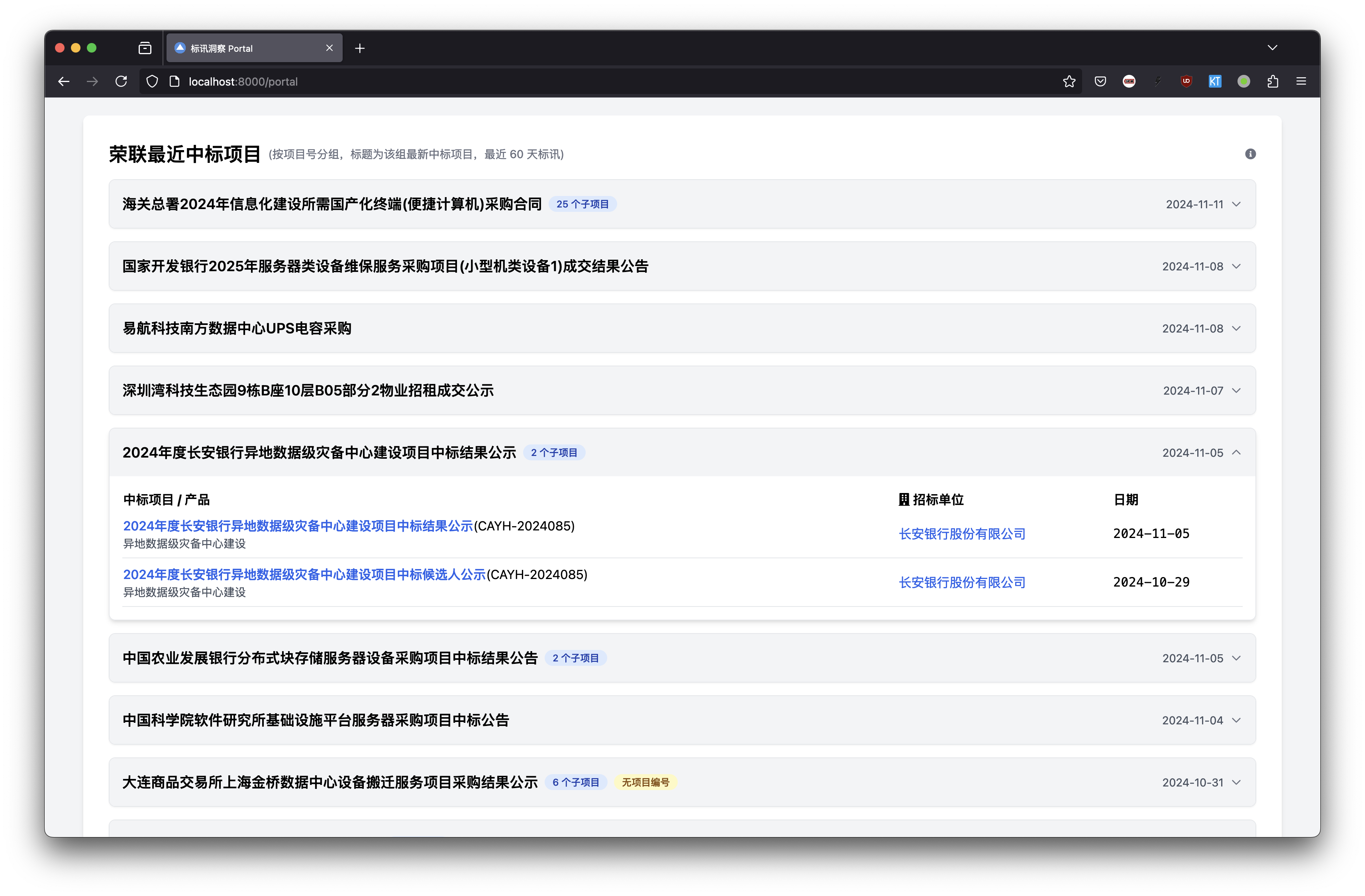 站点数据来自「寻标宝」公开数据,不会预先采集数据,仅当用户首次访问时才会「按需加载」。有需要的小伙伴可以订阅寻标宝会员查看更详细的招投标数据(这个站点没有)。