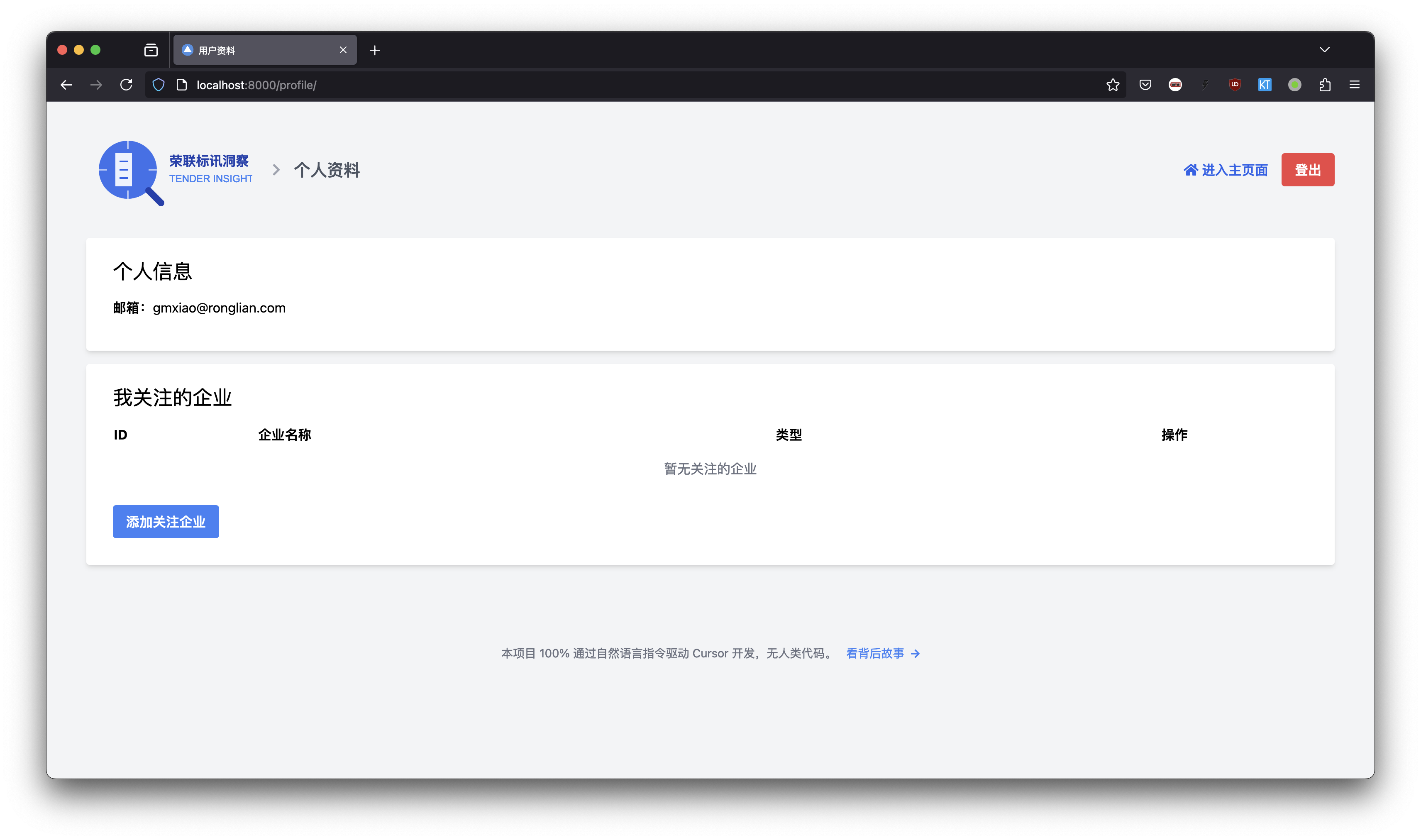 概述登录输入公司邮箱给你的邮箱发了一个登录邮件,点链接就能自动登录也可以使用验证码登录个人信息 & 关注企业「确认添加」关注企业有了「关注的企业」了,点左上角回「标讯洞察」主页↓看看标讯洞察主页在「个人资料」或在企业「招标方视角」关注了企业如果没有「关注的企业」是下面这样竞争对手(关注的「中标方」企业)最近中啥标了荣联最近中啥了,点击分组可展开荣联的历史客户,有啥新动向企业有两个洞察「视角」从首页或其它链接看「关注客户」,准备洞察数据洞察数据准备得差不多了,注意这是「招标方视角」真的准备好了,它会自动跳过去点击企业名称右侧的「投标方视角招标方视角」可以切换,它居然需要再准备一次数据数据又准备好了,跳过去核心供应商 or 主要客户,具体看是哪个「视角」下联系